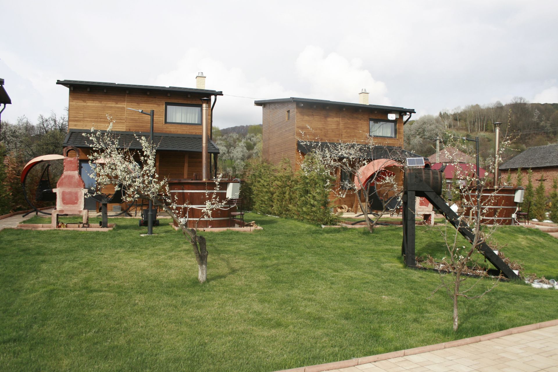 Trei vile identice, pe marginea lacului, urează musafirilor bun venit și te îmbie la relaxare cu un living la parter cu bucătărie și șemineu, un salon pentru servirea mesei, terasă la parter cu vedere spre lacul din spate unde se poate pescui și face plajă și cu două balansoare, în față, cu loc special pentru grătar și ciubăr.