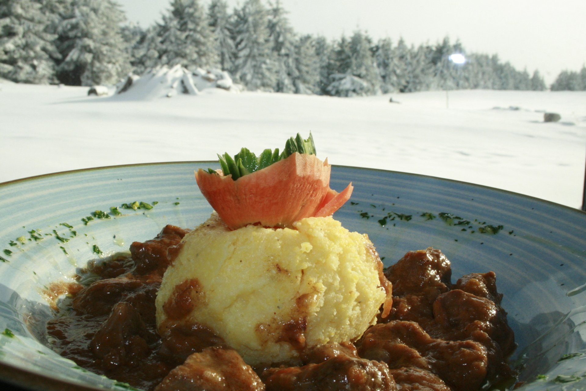 Prima oprire am facut-o chiar la prima locație de pe platou, Pensiunea „La Popasul Cerbului”, o pensiune care îți asigură tot confortul necesar în orice perioadă a anului. Afară era o ceață deasă și un frig demn de luna decembrie, dar căldura cu care am fost primit a făcut ca vitregiile naturii să pară ceva total nesemnificativ. Aleea către intrarea în pensiunea propriu zisă era flancată pe stânga de un om de zăpadă vesel care te invita către căldură și ospitalitatea bănățeană și, pe partea dreaptă, de o bancă a cerbilor, numai bună pentru un vin fiert sau o răchie bănățeană la ceas de seară.
