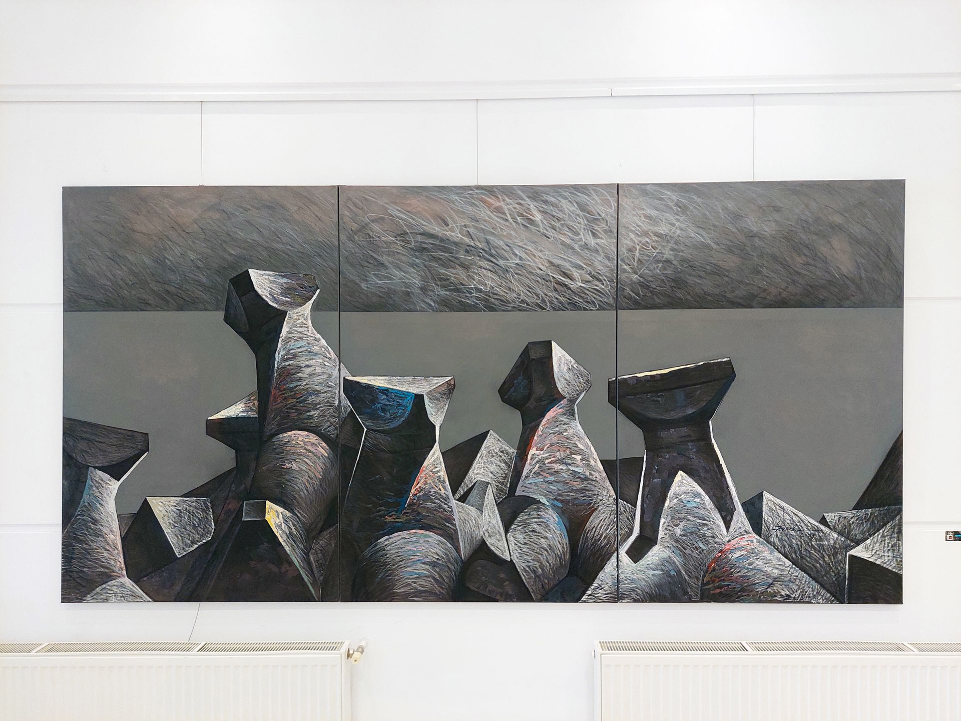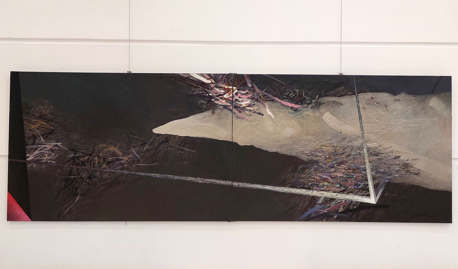 În cazul artistului Eusebio Spînu este vorba despre picturi în acrilic, dar în care intervine cu pastă de relief. Pasta de relief creează anumite texturi și materialități și chiar uneori se produc anumite crăpături în stratul de culoare. Astfel încât se simte cumva în spate formația sa de ceramist, pentru că aceste structuri amintesc de volumele de lut ars, uscat și uneori crăpat. El merge pe niște geometrii pure care alternează cu zone tratate în manieră expresionistă cu tușe mici, agitate și foarte dinamice.”